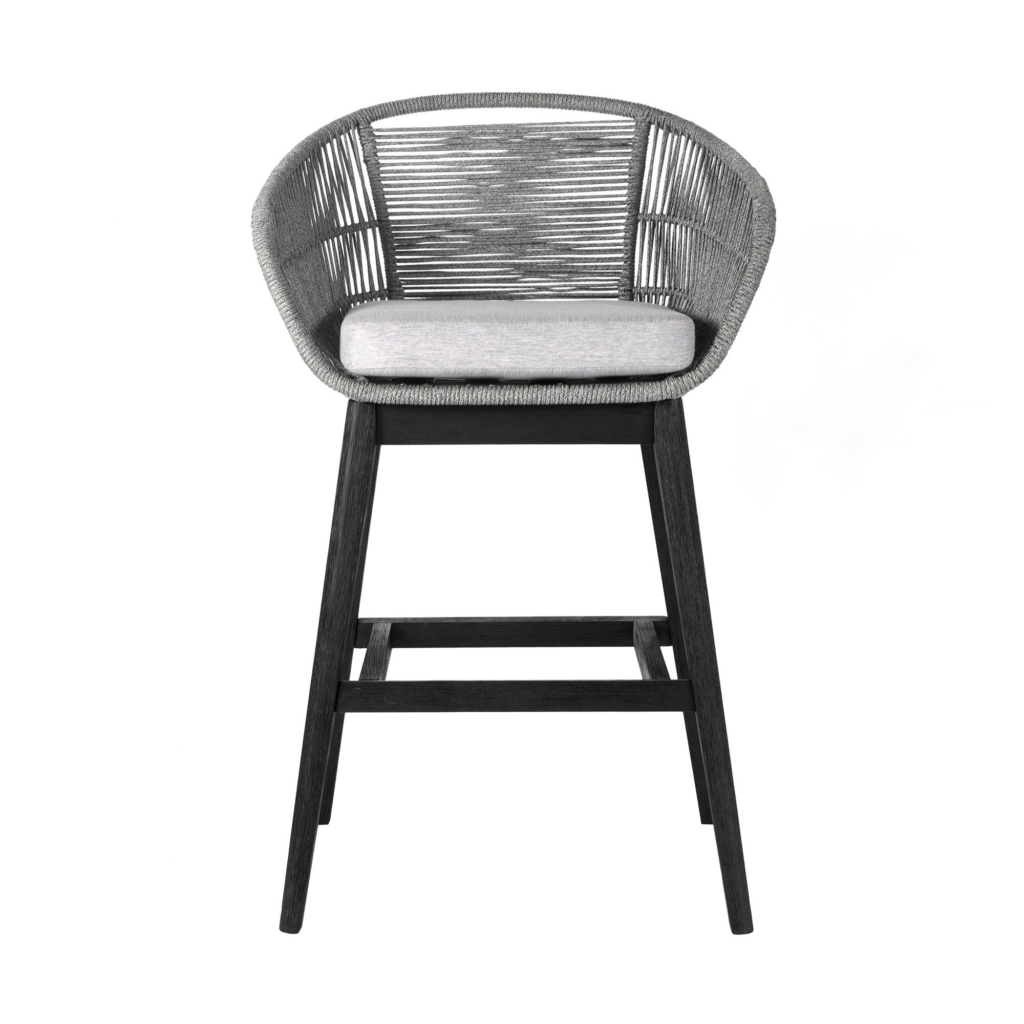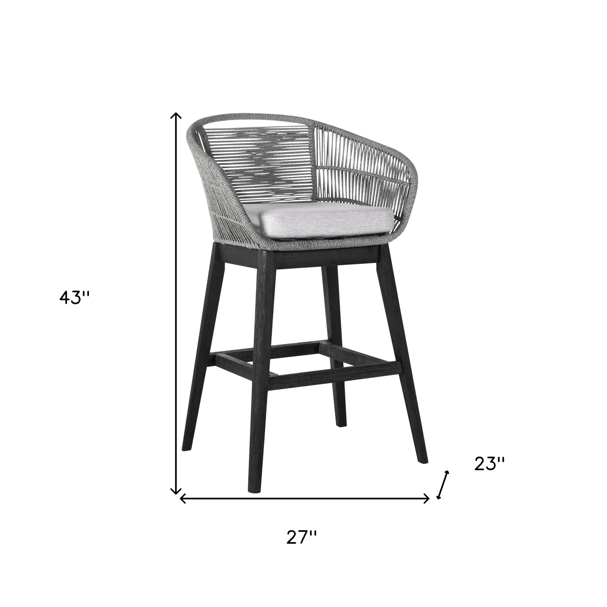 Bring a trendy bar vibe to your space, with this 43-inch light gray solid wood low back outdoor bar height chair with footrest. Allow the enchanting black and gray color to leave a memorable impression and highlight your one-of-a-kind persona. With detachable cushions, you have the convenience of being able to easily replace or clean specific cushions in case of spills, stains, or wear and tear. When it comes to cushions, you want a color that proudly echoes your personality and enhances your overall aesthetic. These cushions in light gray will do just that. Designed with armrests and footrests for your comfort and convenience from top to bottom. For outdoor gatherings on the deck, yard, patio or poolside, this bar stool is a comfy and trendy option. 43-inch H x 27-inch W x 23-inch D