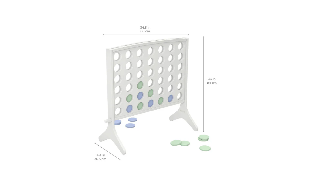 Four in a Row offers oversized outdoor fun for all your friends and family. It features a giant white all-weather board and two sets of large colored chips in sage green and sky blue.